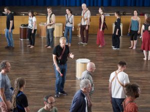 Erleben von Rhythmus. Dabei ist unser Körper das Musikinstrument. Im Rhythmuskreis, einem kraftvollen gemeinsamen Raum, getragen von der Basstrommel in der Mitte, können wir Vitalität und Freude, wie auch Stille erleben und Stress loslassen.