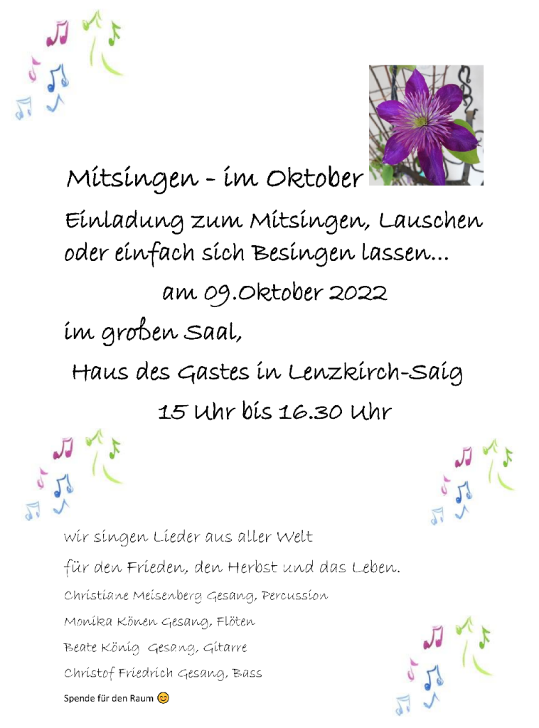 Alle weiteren Infos: Ort: Haus des Gastes, 79853 Lenzkirch-Saig Kosten: 130 Euro Info/Anmeldung: Christiane Meisenberg 07653-964513 oder 015255235151 chr.meisenberg@web.de